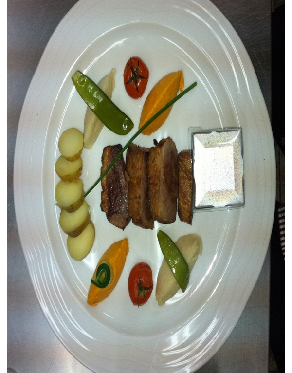 Plat: | Poissons, Goujonnettes de bar , à la purée de basilic, Minute de saumon ‘fleur de thym’ et poivron rôti, Tranche de thon rouge et son effilochée de légumes croquants, Pavé de bœuf à la plancha, moutarde à l’ancienne, Suprême de volaille, citron confit et brunoise de légumes, Noix d’entrecôte grillée au thym coulis de vin rouge à part, Épaule d’Agneau confite au four, accompagné de son riz créole, Magret de canard rôti a la griottine, purée maison, Carré de veau a la parisiennes, Pas de plat |