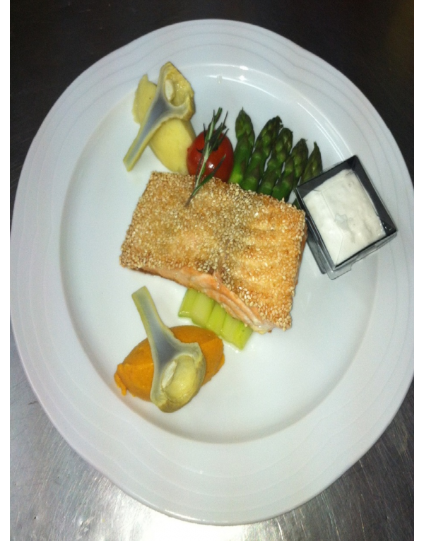 Entrée: | Tatin de foie gras aux mangues caramélisées, Salade du périgord au confit, Nems croustillants de volaille, sauce ravigote, Croquants de saumon au basilic sur mescluns d’herbes fraîches, Salade végétarienne, salade verte et légumes de saisons, Mille feuilles de saumon fumé et poivre vert, salade mesclun, Assiette norvégienne Crème de citron au basilic, Salade du Périgord au canard fumé, et sa terrine de foie gras, Terrine de foie gras,rhubarbe et chutney de fruit exotique, Pas d\\'entrée |